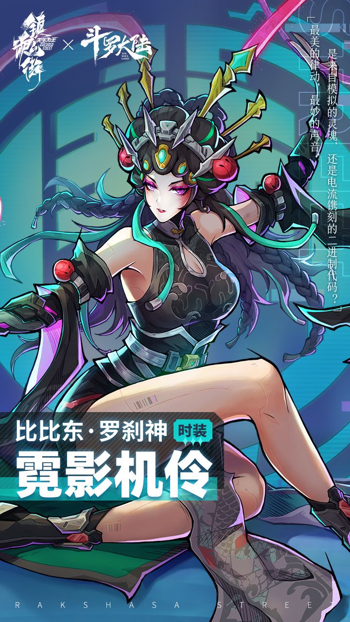 “最美的律动,最妙的声音,是来自模拟的灵魂,还是电流镌刻的二进制代码?”新版本跟随联动角色「比比东·罗刹神」将推出专属时装【霓影机伶】。这一款国潮风格的时装,它是由一袭黑色旗袍和精致华丽的银白色花纹刺绣组成。脸部采用了戏曲旦角的妆容,这些戏曲元素让它更加有辨识度。同时,盔头上的紫红色翎毛增加了整体的气场和张扬感,增添了不少神秘感。国潮与机能风的碰撞,呈现出别具一格的新国潮美术风格。