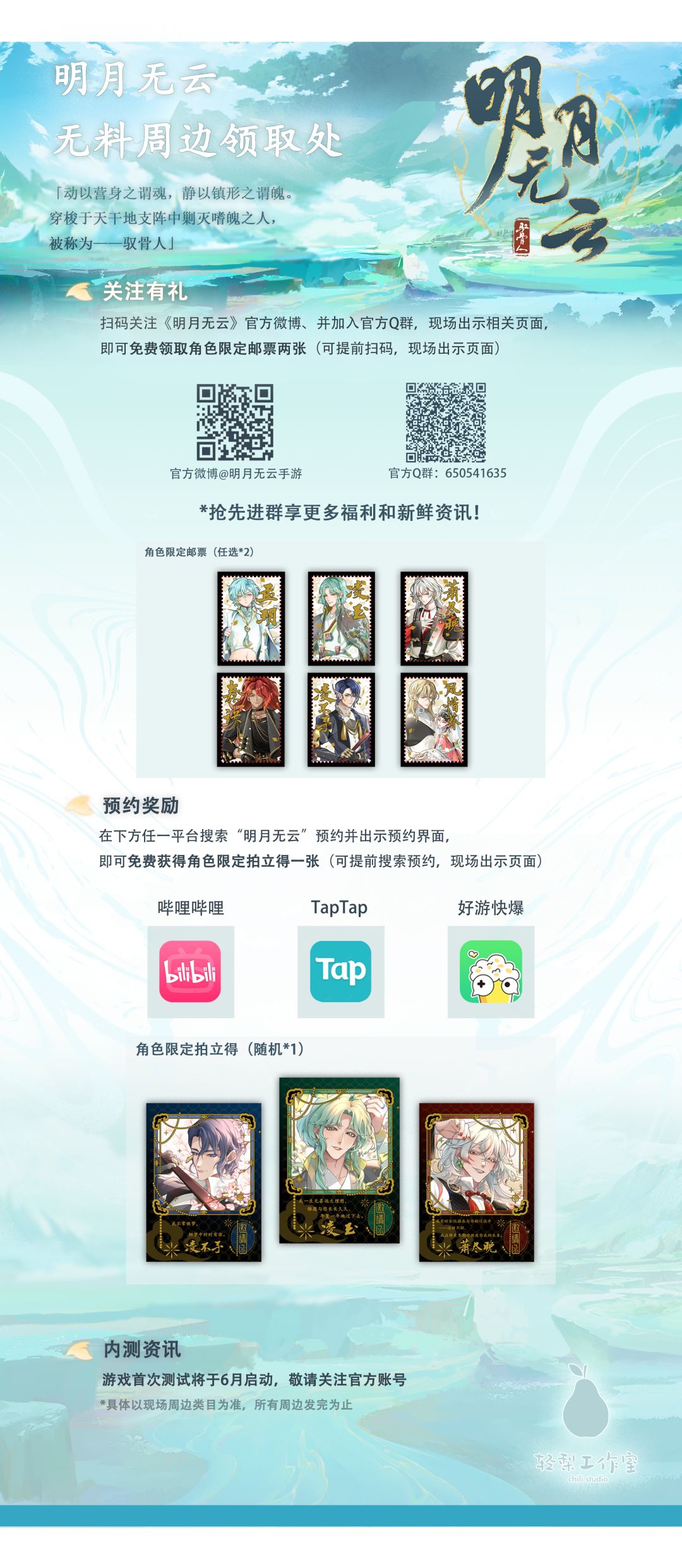 1. 关注《明月无云》官方微博、并加入官方Q群,现场出示相关页面,即可免费领取角色限定邮票两张(可提前扫码,现场出示页面)