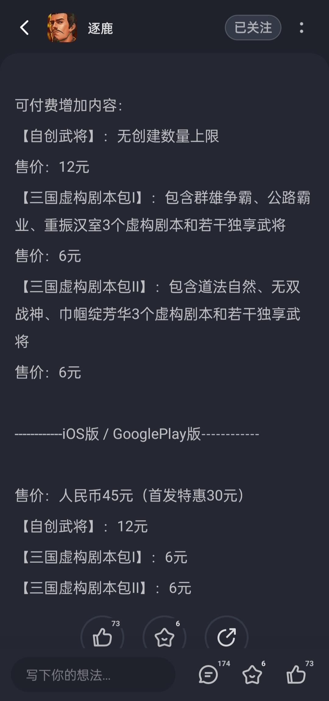 我个人认为把本该属于本体的内容加进去就非常合理了,其他付费本来就是正常的,而且价格也不贵,咱们看3 14这个价格一对比咱们都看得出来哪个更良心了吧。而且《逐鹿》是国产加手游双buff加持哦!这里我再重申一遍:是国产,三国,手游哦(就是要联网是它一大遗憾)。