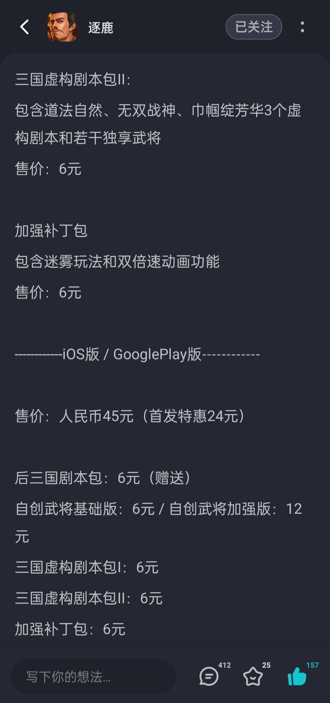 但就在昨天,我们最亲爱的老帝鸽鸽~又出来整活了,还整了个好活:价格的调整。把本该在本体的内容,二倍速和迷雾模式加进去了。(我个人认为是采用了小黑子帖子下的价格调整建议二的,因为改动后的价格十分有十二点五分的像 )此外还将自建武将功能改为无限制。(附老帝鸽鸽先后两帖价格图,前帖为图①后帖为图②)