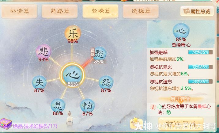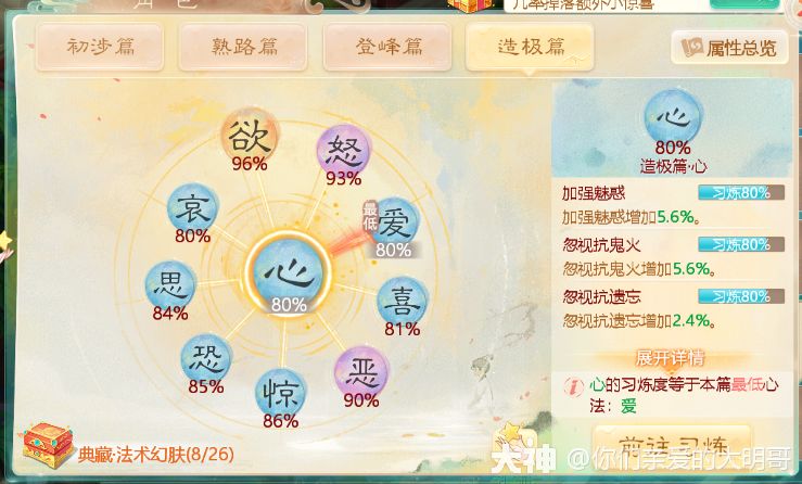以女鬼举例可以看到,中心位置的不论是强法还是强忽视,都有了明显的进步,“心”位每进步1%,忽视鬼火增加0.07%、忽视遗忘增加0.03%、加强魅惑增加0.07%,增加的属性通用任务和PK。