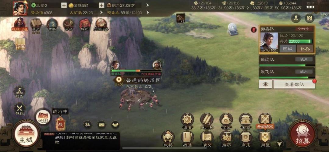 这是两个游戏的共同点,都需要打地,并且地的数量是有限的,尤其是高级地。但实际上又有不同。战棋版中,地的位置是聚在一起的,一个郡只有木铁石粮四个地,每个地里有100个这样。战略版就是真实模拟,自然分布。