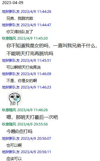 9号的时候,我的新地狱队友又跟我说要弃坑,不玩暴走了,当时是星期天,我就让他星期一再跟我打一次,他同意了,到了4月16的时候,我又不得不开始找队友,还是不太想混野队,跟野人一起打,当时我在论坛看见有个人发帖,说加这个群,群主免费带你打地狱,我就加进去了想薅羊毛,群里还有不少人认识我,跟我打招呼之类的,但有个管理却说叫我不要来这里搞出什么幺蛾子,我听着很刺耳,只是我也知道自己有严重的前科,不适合再生事端,还没等到那个群主带我,我就退了,前面加了一个人蛮多的地狱圣龙岛群,但是在里面找了三次队友,都没找到,也退了,感觉找队友还是论坛靠谱。