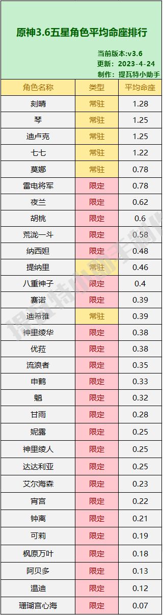 众所周知,在原神中除了埃洛伊之外,每个角色都有自己的命之座,一般情况下,角色的命之座都是对伤害或者机制上有提升,也有不少玩家愿意为之买单。那么问题来了,到底哪些角色的人均命座最高呢?今天Z哥就来跟大家分享一下3.6版本全角色(除旅行者和埃洛伊)人均命座排行,数据来源于提瓦特小助手的角色平均练度统计,非官方数据,仅供参考。话不多说直接给大家上图。以下是五星角色的平均命座排行: