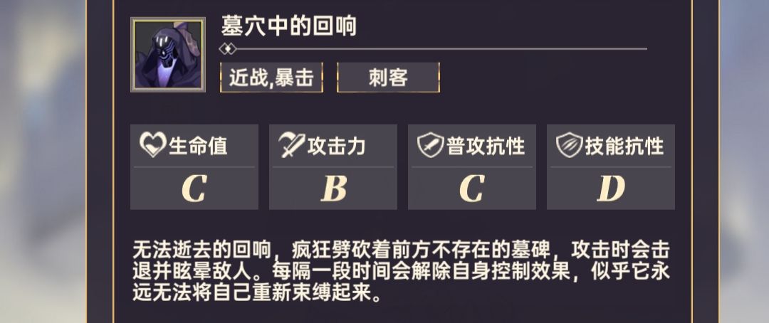 墓穴中的回响:刺客,较大攻击范围,普攻随机附带击退或眩晕,每隔一段时间时间发动技能接触受到的控制。