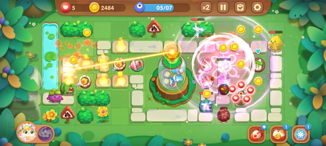 除了放置养成社交的玩法,在塔防战斗方面,《遇见喵克斯》也可以说是“新”意满满。虽然塔防战斗需要猫咪们“英姿飒爽”的输出,击败来袭的水果怪,但整体画风依然充满了欢乐和治愈的调调,萌斗萌斗的,也算得上是甜飒双杀啦~