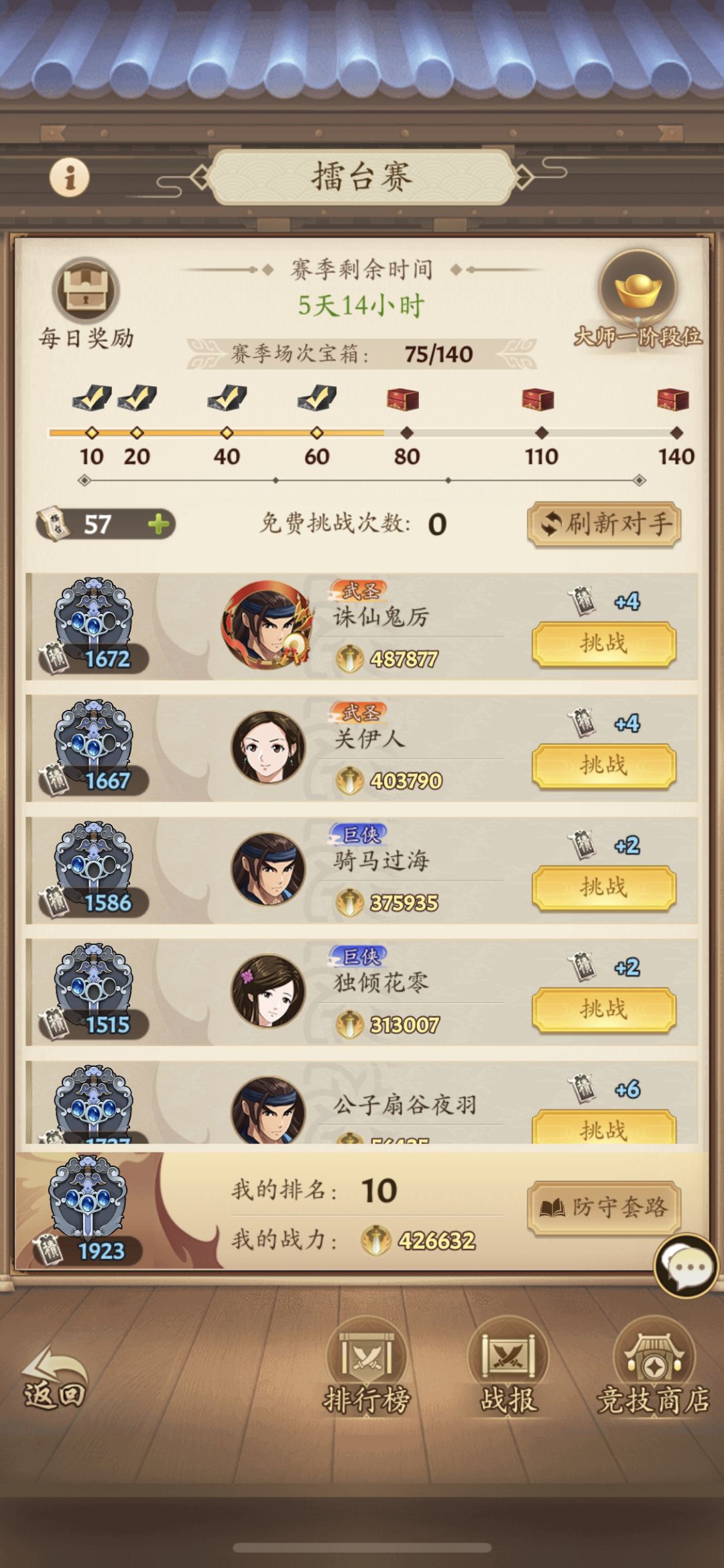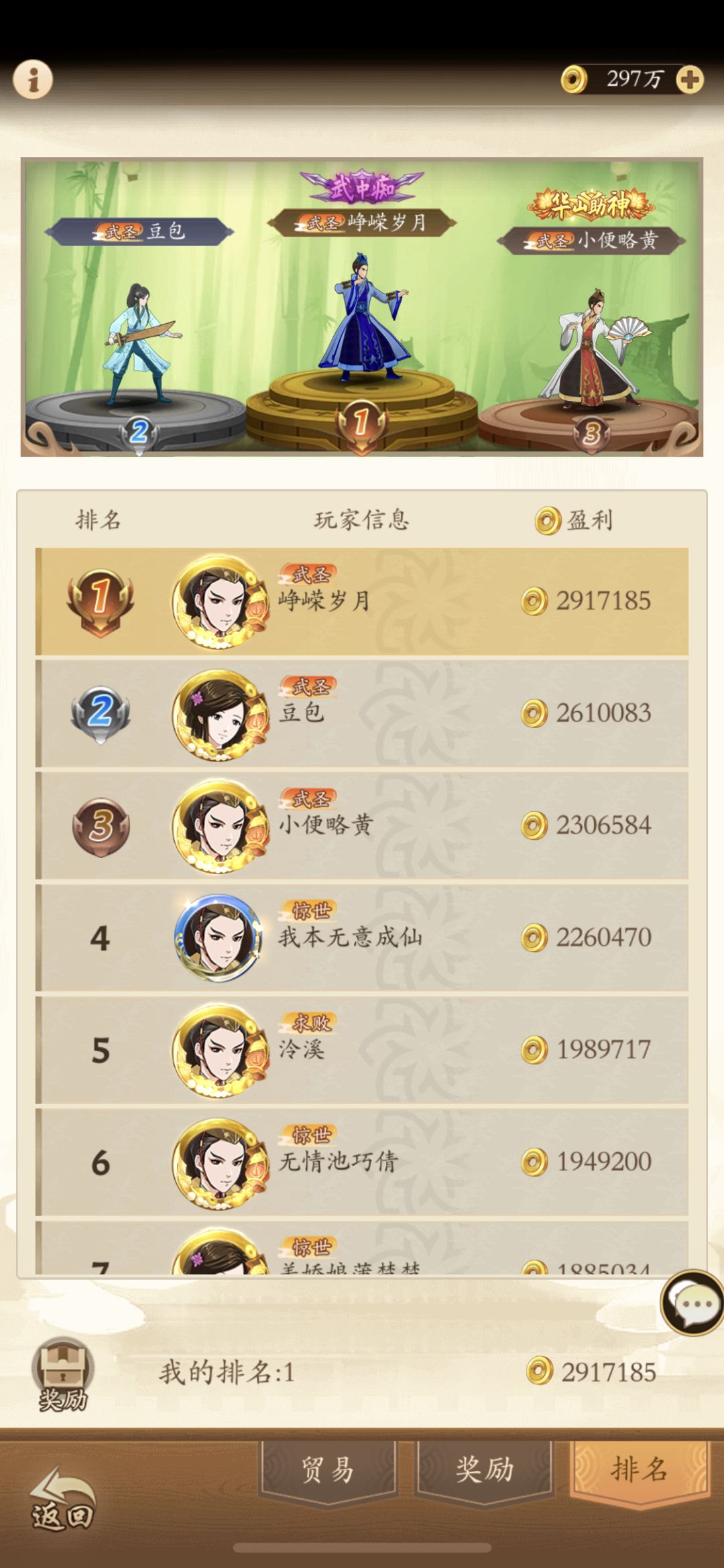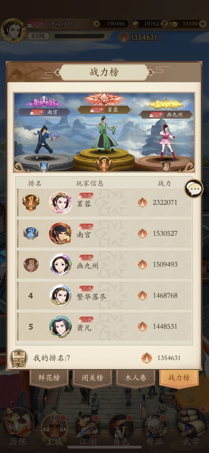 为了防止有些人觉得攻略不行,先说一下目前战绩,0氪萌新两个月,前期战力稳定前五十,目前18,前面比我高的都是氪金的或者开了月卡跟终身卡的,因为0氪vip等级加速跟不上他们,武林大会每天打十次稳定前十,擂台免费次数用完稳定前二十。