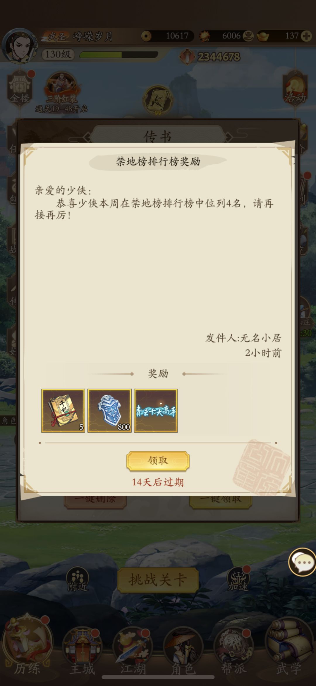 前期冲榜每天登录第一件事就是领经验,卡时间段升级,日常练功有时间可以每天都点完,没时间可以3天点一次,江湖风云每天扫荡,
