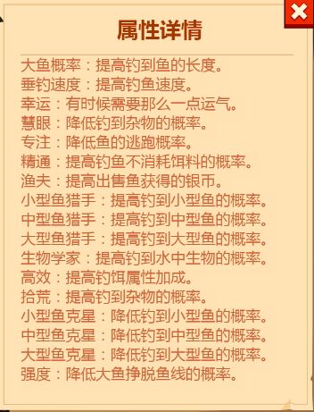 这些属性属于通用性的属性,而且不会影响我们钓到某类鱼的概率,所以如果洗出来基本可以无脑保留。相对来说,“活力”和“清道夫”相对不重要,如果和其他不好的属性一块洗出来可以考虑放弃。