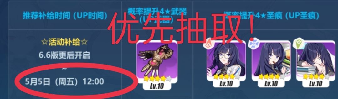 №1,特惠物理辅助池子,必抽,极大程度降低入坑成本,再前期圣痕也可以给主C过度,时间太紧张,建议5月5号前入坑抽取,池子过时就不用入坑了。