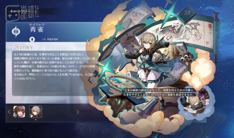 举例来说,《崩坏:星穹铁道》里有一位热衷打麻将的角色名叫“青雀(seijyaku)”,在打造该角色的时候,我们观察了身边的麻将发烧友,“喜欢麻将的人平时是怎么行动的?”“喜欢麻将的人会讨厌什么?”,然后将此类特征融入到了角色身上。(笑)。