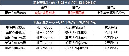 五、充值豪礼【活动名称】充值豪礼【活动时间】4月26日维护后~4月29日5点【活动简介】活动期间累计充值达到指定金额即可领取惊喜礼包!