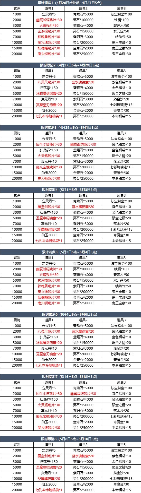 四、每日累充【活动名称】每日累充【活动时间】4月26日维护后~5月10日5点【活动简介】活动期间,每日累计充值达到指定金额即可领取相应好礼。