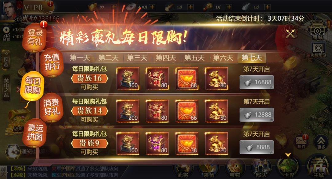 活动期间,每天可使用元宝购买当日的限时礼包,每档限购买1次。