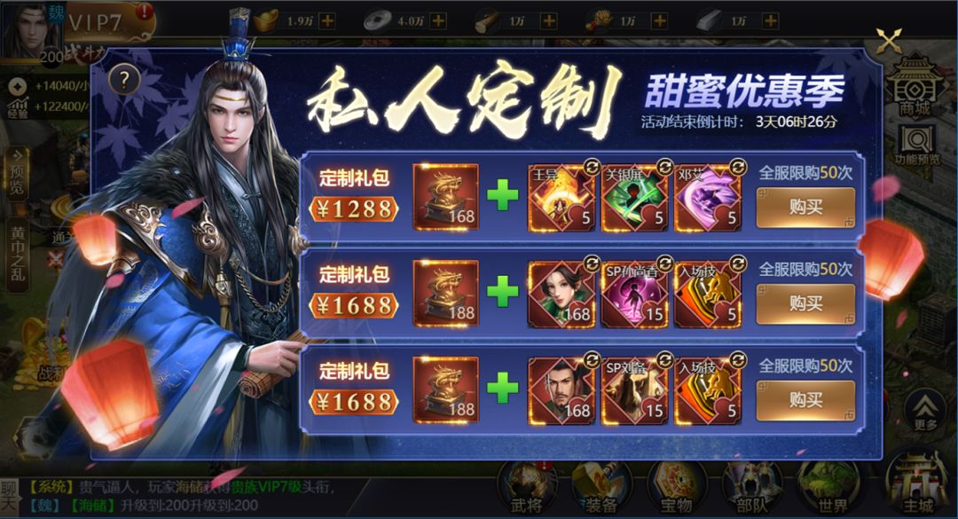 7.定制礼包:限时开启,SP刘备、SP孙尚香加入,极品道具任意搭配!
