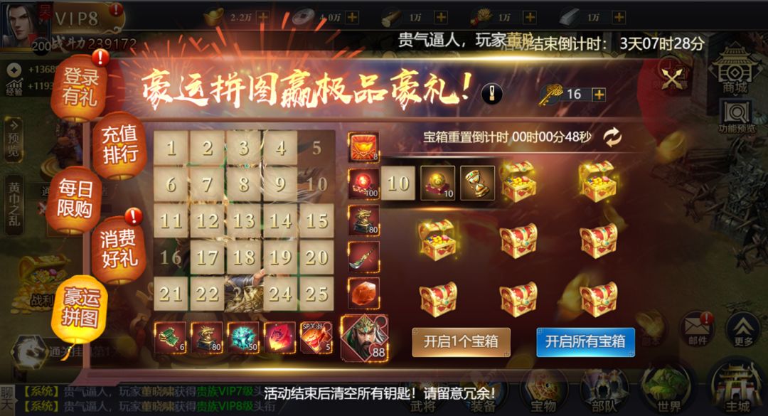 5.豪运拼图:参与拼图玩法,完成拼图任务即可获得稀世珍宝,SP关羽将魂首次加入!