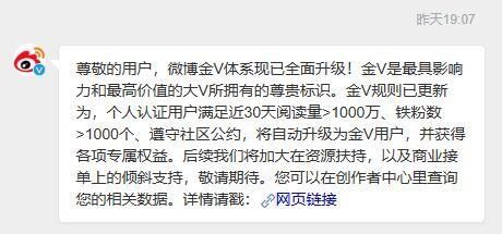 微博官方于4月24日发布公告,金V体系现已全面升级,将锚定高影响力&高价值大V定位,去水提质,通过“流量+社交”的衡量,体现作者对粉丝的消费带动能力,包括其粉丝价值。