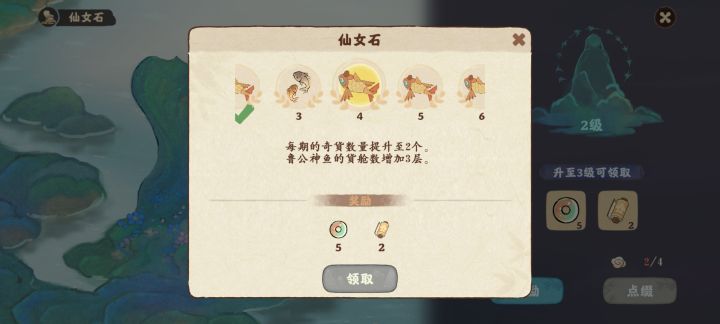 四、仙女石升级材料水云石通过水面开荒获得。升级可增加鲁公神鱼货仓、每次奇货种类(最多两种),奇货价值加成(初始是1.5倍)