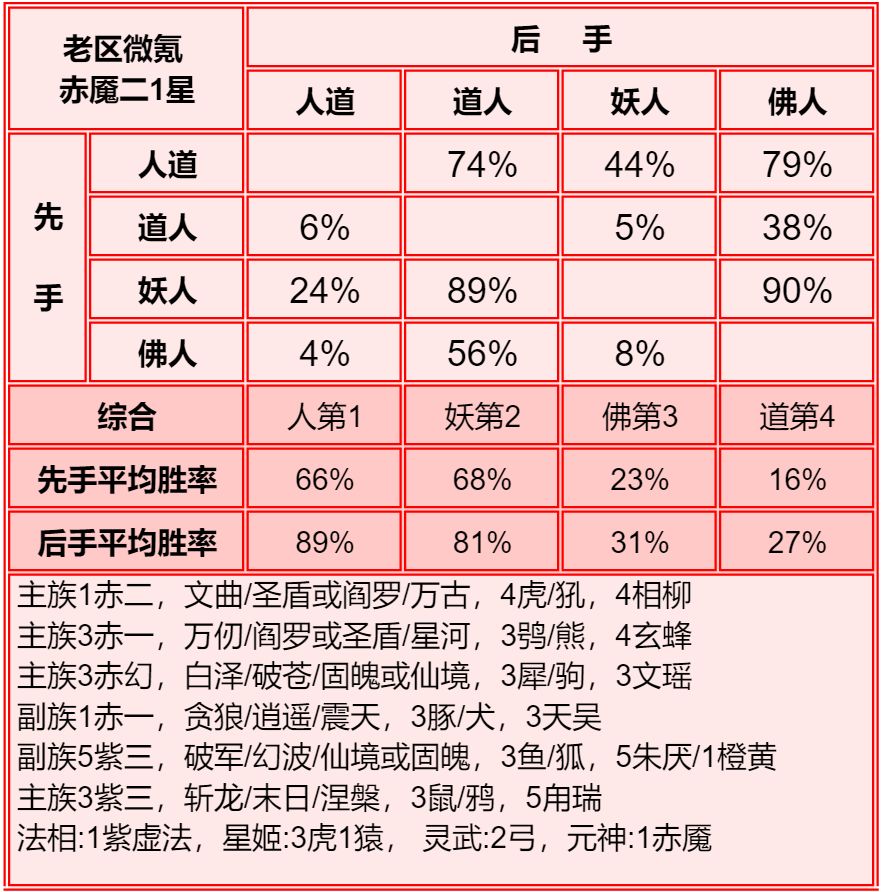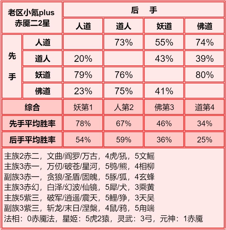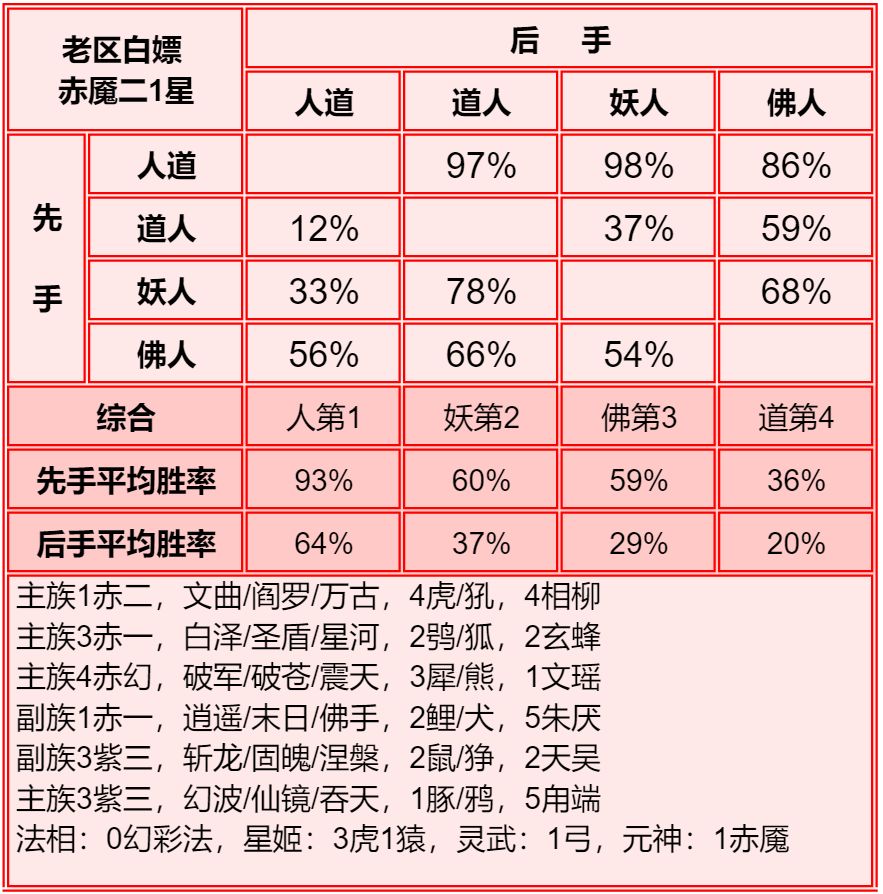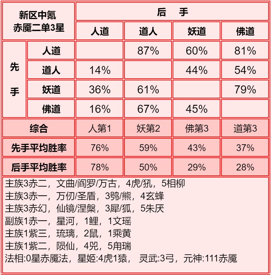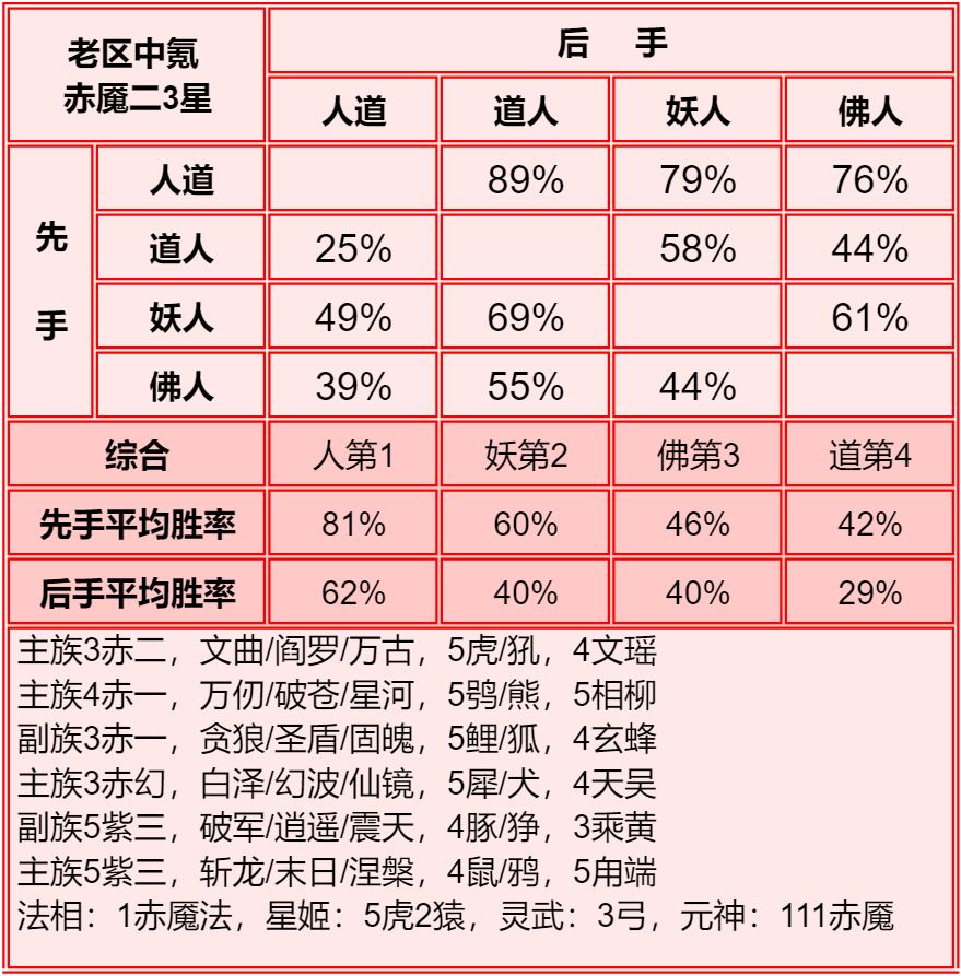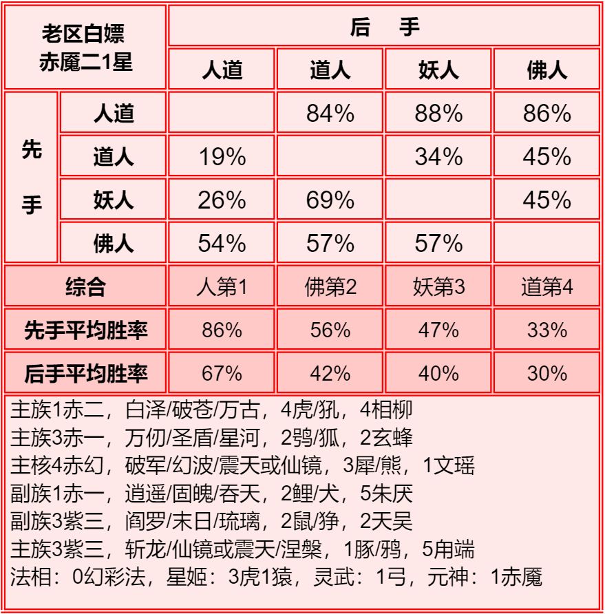 四族进行了2+1和单3的内部淘汰测试,均为单3胜率高于2+1,故均保留单3胜率。赤2版本更强调同族赤魇神仙的共同作战,实测45书环境下,副3星赤1的胜率高于副1星副族赤2。幻化均为使用本族幻化胜率更高。赤魇二3星副族如果连2回合都撑不了,赤魇二单5星要强于3+3星。