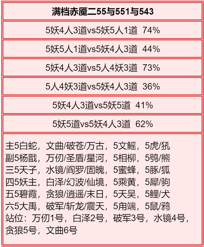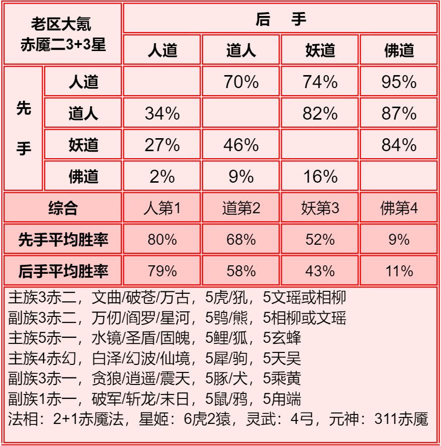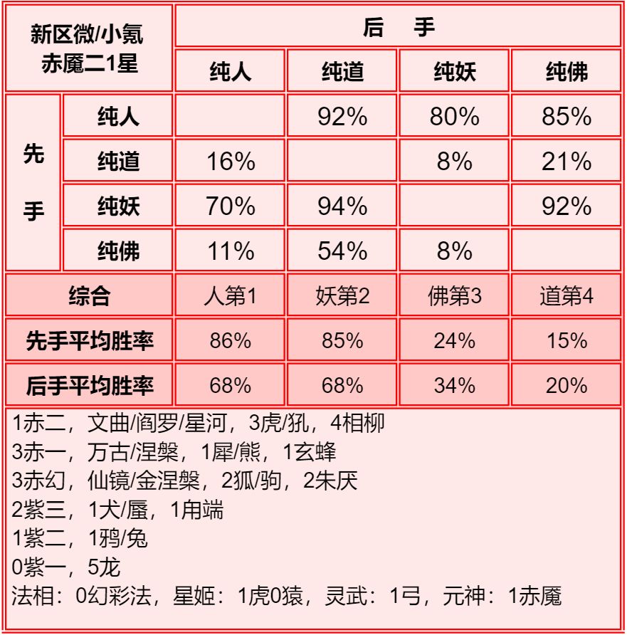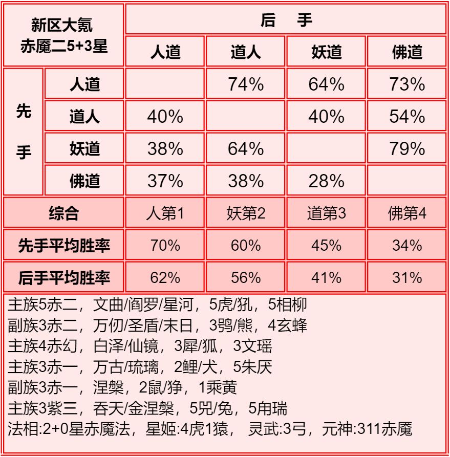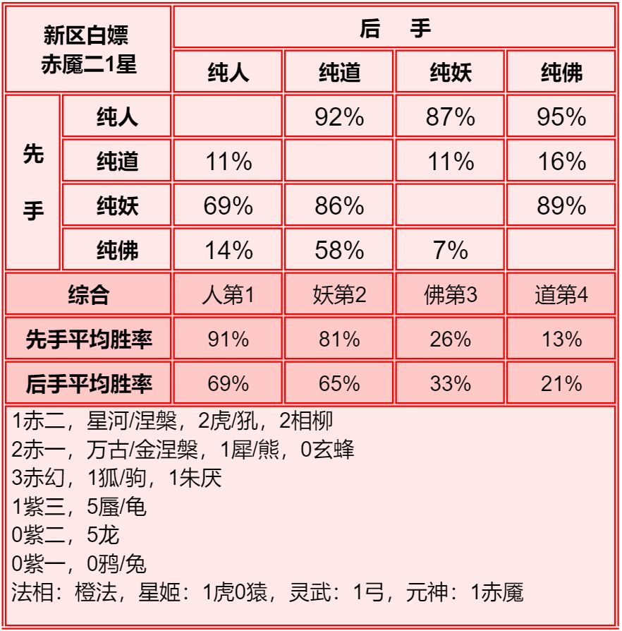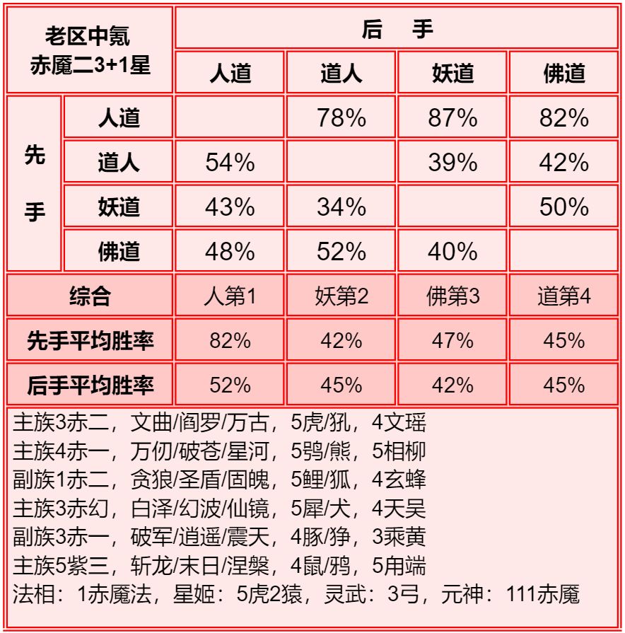 四族进行了2+1和单3的内部淘汰测试,均为单3胜率高于2+1,故均保留单3胜率。赤2版本更强调同族赤魇神仙的共同作战,实测45书环境下,副3星赤1的胜率高于副1星副族赤2。幻化均为使用本族幻化胜率更高。赤魇二3星副族如果连2回合都撑不了,赤魇二单5星要强于3+3星。