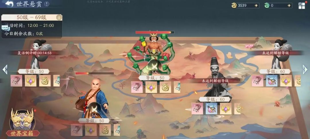 『世界悬赏』是大型pve活动,开服第二天解锁(需达28级),活动时间为每天中午12点到晚上21点。其中赤鬼王最好刷,拜月水魔兽最难刷,这是这游戏唯——个比较肝的地方,因为要一直刷直到boss死亡。