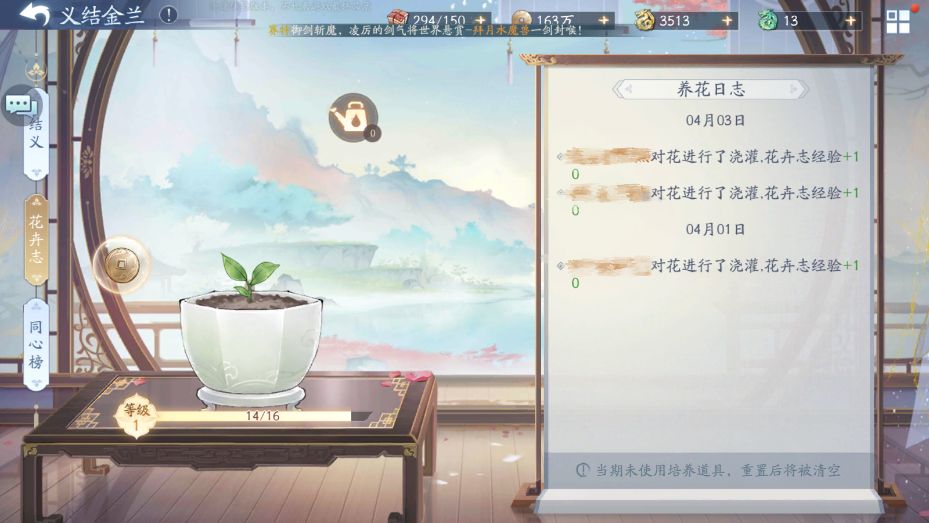 Tips:友友们记得一开服就尽快结金兰!因为『花卉志』进度和花卉志奖励将会在每月初重置,为了避免时间不够拿不满奖励,抓紧结金兰很重要!(敲黑板!)