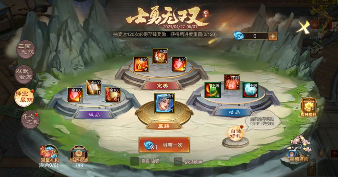 累计抽奖达120抽必得至臻奖励梦*蔡文姬-闻鸡破晓,获得梦*蔡文姬-闻鸡破晓后至臻奖励将更换为其他宝物。