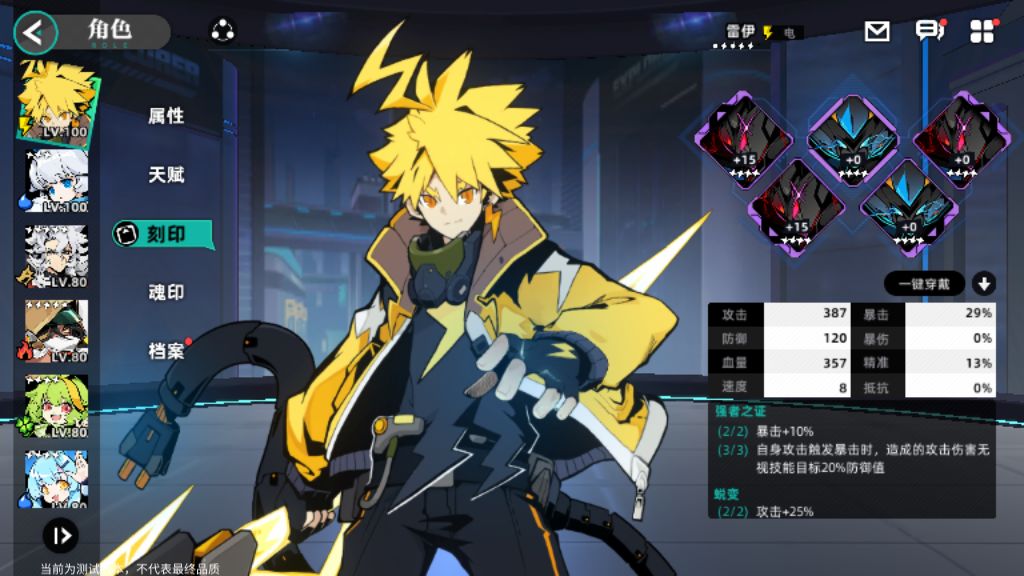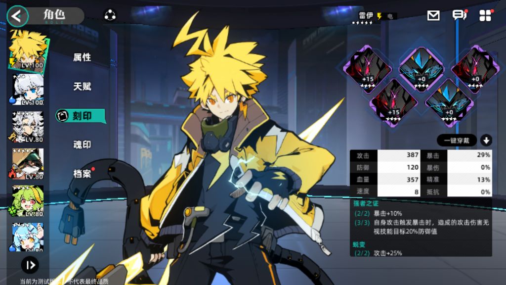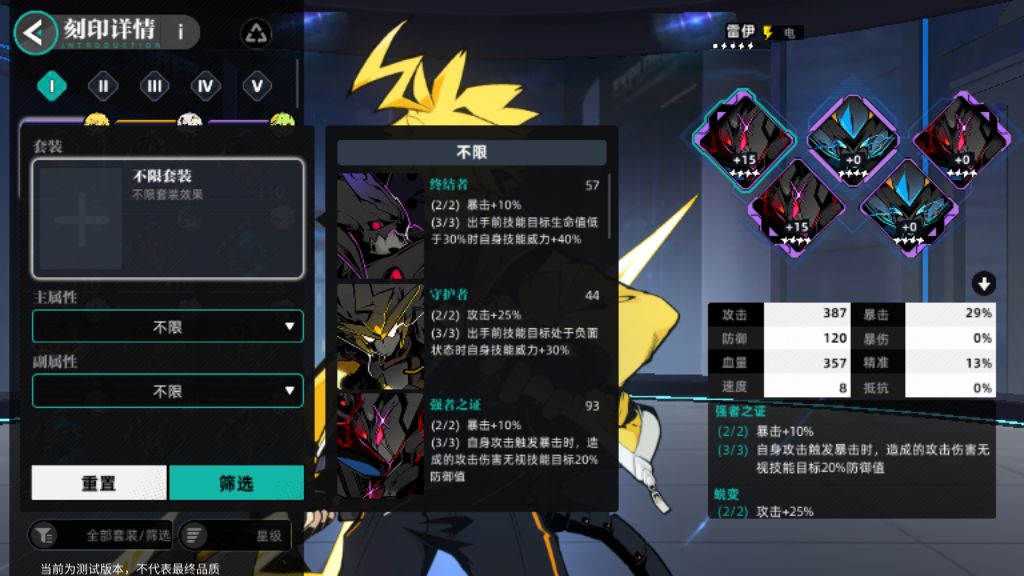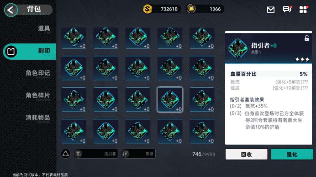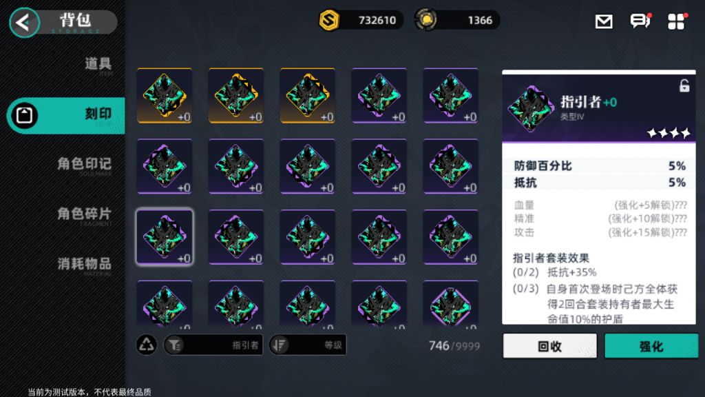 刻印套装分为15套,每个角色只能带5个刻印,2个或者3个一样的刻印就可以激活套装效果,所以每个角色的刻印套装基本都是2+3,每个刻印都有主词条和副词条,词条属性有11种,升级就可以提升主词条属性和解锁副词条属性,每5级升级和解锁,白色和蓝色的刻印满级10级,紫色刻印满级15级、金色刻印满级20级,刻印基本刷矿区产出,紫色和金色都有两条主词条属性,蓝色白色只有一条主词条属性,金色有4条副属性、紫色3条副属性、蓝色和白色都是2条副属性,由于升级刻印需要用到刻印核心和斯特(金币),越高级的刻印用到的材料就越多,橙色20级满级得776个刻印核心和38万8千斯特,紫色15级满级得226个刻印核心和11万1千斯特,蓝色10级满级得46个刻印核心和2万3斯特,白色10级满级得23个刻印核心和1万1千5斯特,回收已经升级的刻印会返回一半的刻印核心,但不会返还斯特。所以白色和蓝色一般5级开荒用,紫色10级就够用,有好的属性可以升满,金色也是同理,但是想刷到好的金色刻印太难了,应该说掉落概率太低了。