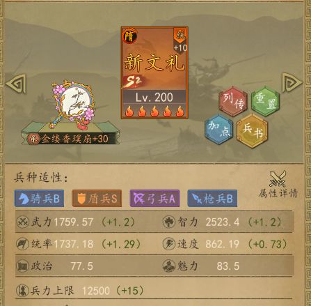 推荐技能如下: 新文礼满配技能:伏兵+国士 如果新区或者中期建议:军略+国士