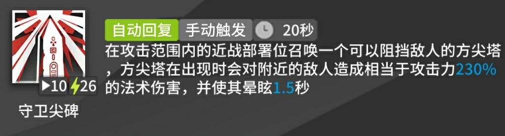 单论输出的话其实二技能的总输出量比一技能还要低,但特别之处就在于二技能可以召唤一个方尖碑,5000的血量和560防御可以有效阻挡三个敌人的前进,而且嘲讽能力可以让方尖碑吸收不少远程伤害从而降低我方干员的生存压力,简而言之就是一个非常优秀的承伤工具。在面临高强度单位时使用方尖碑来拖住他们也是不错的选择
