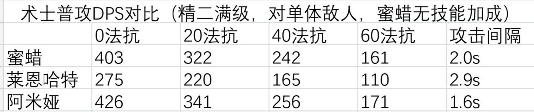 由于基础攻击力稍高于群法,攻速也较快,所以普攻DPS能高出群法不少。但是蜜蜡没有普攻,列这个表只是想让大家知道,在无技能加成情况下,蜜蜡的输出在什么水平。