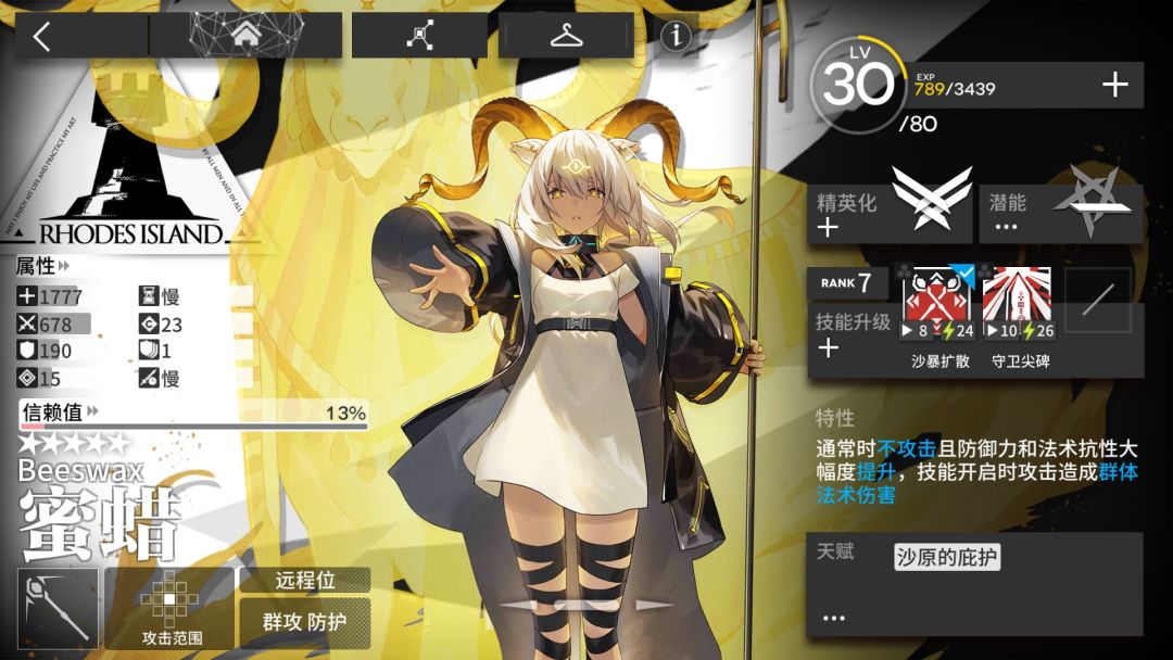 相比输出,蜜蜡更为亮眼的应该是她那夸张的防御力和法抗,在一些有弩箭的关卡,可以用蜜蜡抵挡弩箭在保护高台干员的同时兼顾部分输出,在闪灵等具有加防技能的干员配合下,蜜蜡可以从容的接下浮士德的紫箭。而输出方面相对来说没有特别突出,虽然失去了普攻,但蜜蜡的技能回转优秀只要把握好时间,输出不会比群法低。作为一个拥有新模板的术士,总体强度还算不错