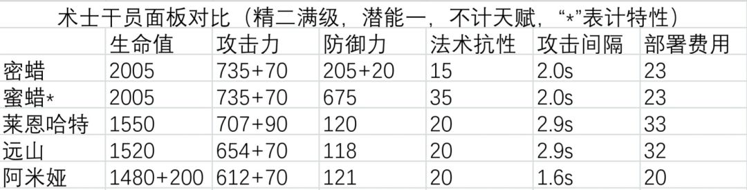 蜜蜡作为拥有新模板的术士干员,光看面板数值,生命值和防御力已超越大部分常规术士,攻击力也高于五星的群法,而且在未开启技能时蜜蜡的特性额外给予防御和法抗加成,使其达到一个相对高台干员而言非常夸张的数值,675的防御已和五星奶盾持平,35的法抗排全干员第二(第一为自爆小车)。所以蜜蜡是当之无愧的“高台重装”