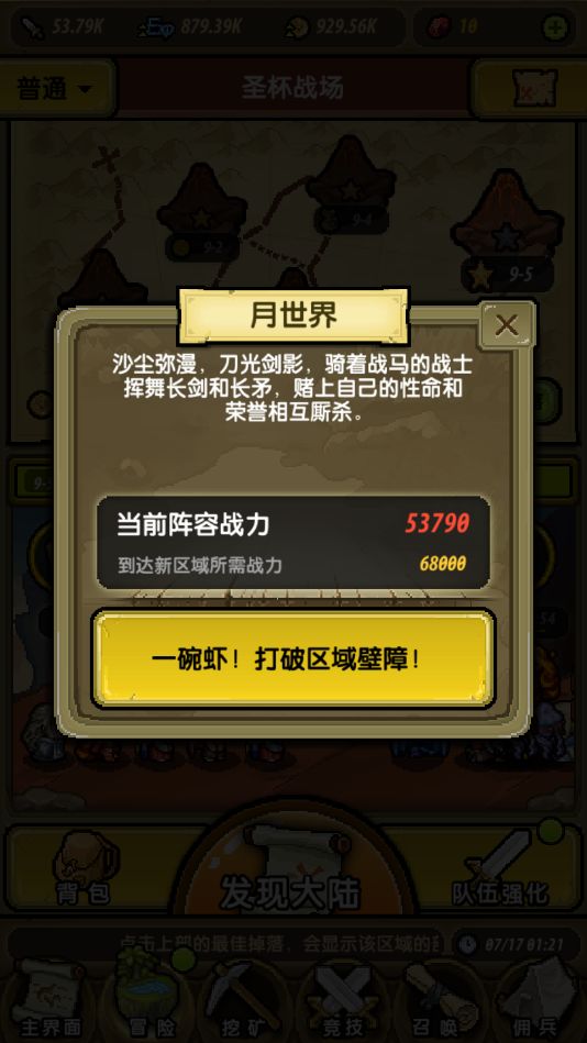 战斗胜利之后,我们就可以进入下一关/下一个区域了。进入下一个区域一般都有战力要求,如果战力不足的话建议可以选一关挂机一段时间再回来收菜提升队伍战力。