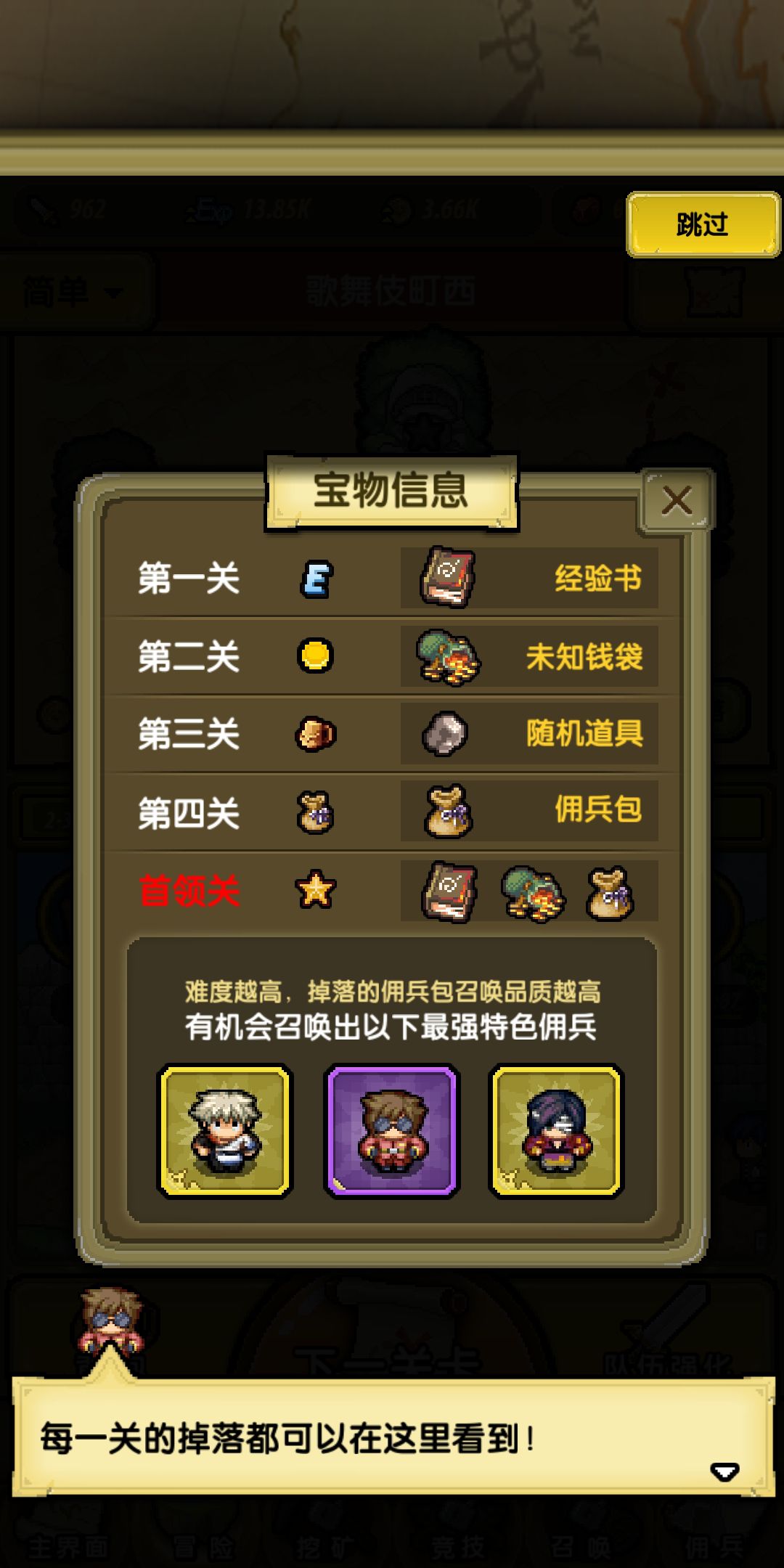 每个区域的掉落可以点击【最佳掉落】按钮查看,一般来说越后面的关卡掉落越好。每个区域掉落的佣兵包能开出的特色佣兵会有所不同,一般同一个区域出产的佣兵都可以使用合体技。如果有需要的朋友可以多在同一个区域挂一下。