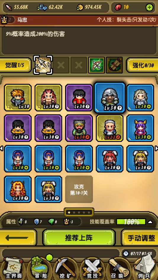 这个时候我们就需要通过调整角色的站位去控制技能发动的优先级了。在《冒险与挖矿》中,队伍中的排位越前,技能发动的优先级就会越高。比如我将马忠调到第四位而首席客服则放到最后一名,在同时满足发动“裂头击”和“不复制不粘贴”的前提下,系统会判定优先发动“裂头击”。这样我们就可以让更多的发动强力技能让战斗过程更轻松了。笔者建议各位按照以下的顺序排列技能: