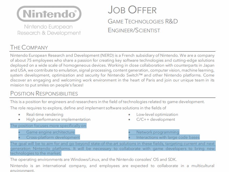 “我们的目标是瞄准并超越这些领域的最先进解决方案,瞄准当前和下一代任天堂平台,”职位列表中写道。“有必要与游戏开发商合作,将新技术推向市场。操作环境是 Windows/Linux,以及任天堂游戏机的操作系统和 SDK。任天堂是一家国际公司,员工应该在多元文化中合作。”