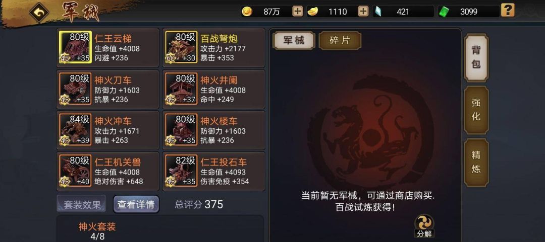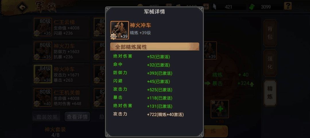其实在三国战纪手游中不管竞技也罢或者百战试炼也好,最实际有效地属性便是攻击,神火军械中尤其是神火弩炮、神火冲车和神火井蘭单这三个军械一旦精炼至40级,立时便可激活数量可观的攻击力。