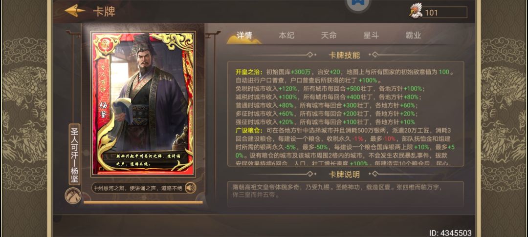 这次更新,新皇帝sp杨坚的出场,是代表帝卡的新强度上线,作为所有的帝卡中唯一的红卡,不同于之前的粉卡强度在金卡与紫卡之间,根据现在的效果来看,大部分全是高强度正面效果,名副其实的帝卡第一卡,而且获取难度也不是太难,相信大部分玩家也都获得了。