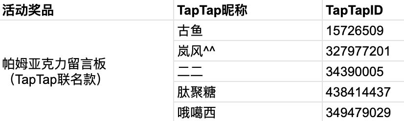 开奖咯!恭喜以下五位幸运小伙伴获得帕姆亚克力留言板(TapTap联名款)一份~