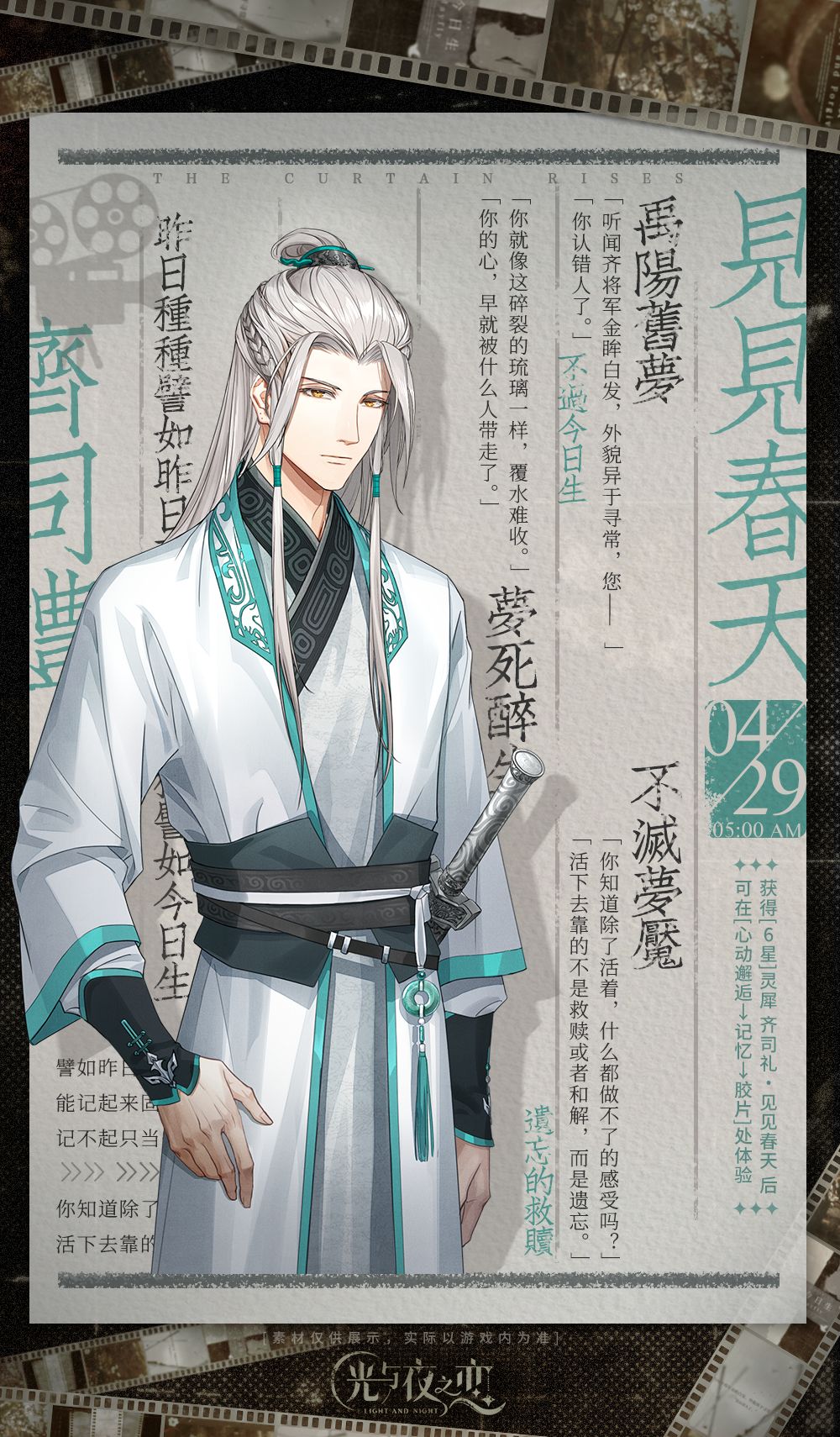 在限定收信[岁月的缝隙・片影/照幽/狭光]中获得[6星]灵犀 齐司礼・见见春天 后,4月29日 05:00起可在[心动邂逅→记忆→胶片]处体验全新胶片剧情。