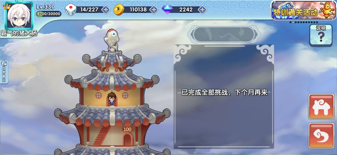 希望大叔能整多些PVE模式,很早就把故事3星了,魔王那就更早通了,后来没多久天玑塔,终极挑战全部刷满了,多些类似魔塔的关卡就好了
