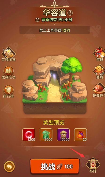 1、布阵:华容道界面点击布阵,可以在布阵界面选择英雄上阵,华容道每波结束会有华容币和华容令奖励,