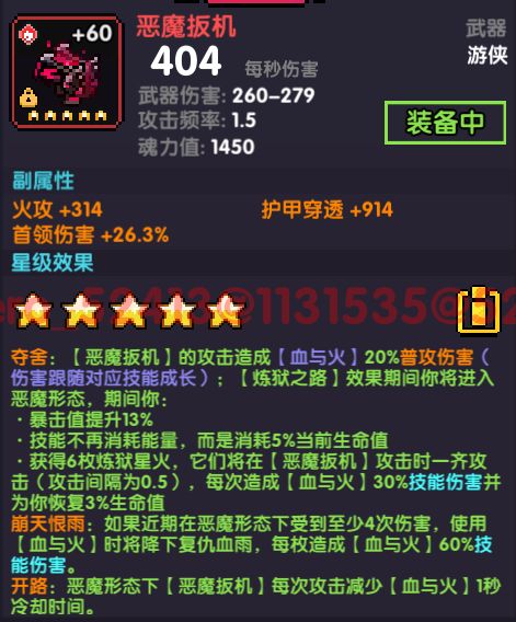 恶魔扳机(魔女武器)攻击时造成20%血与火(橙技能)的伤害,这个伤害指的是(武器伤害466%+1366)这部分,而不是4*(武器伤害466%+1366)