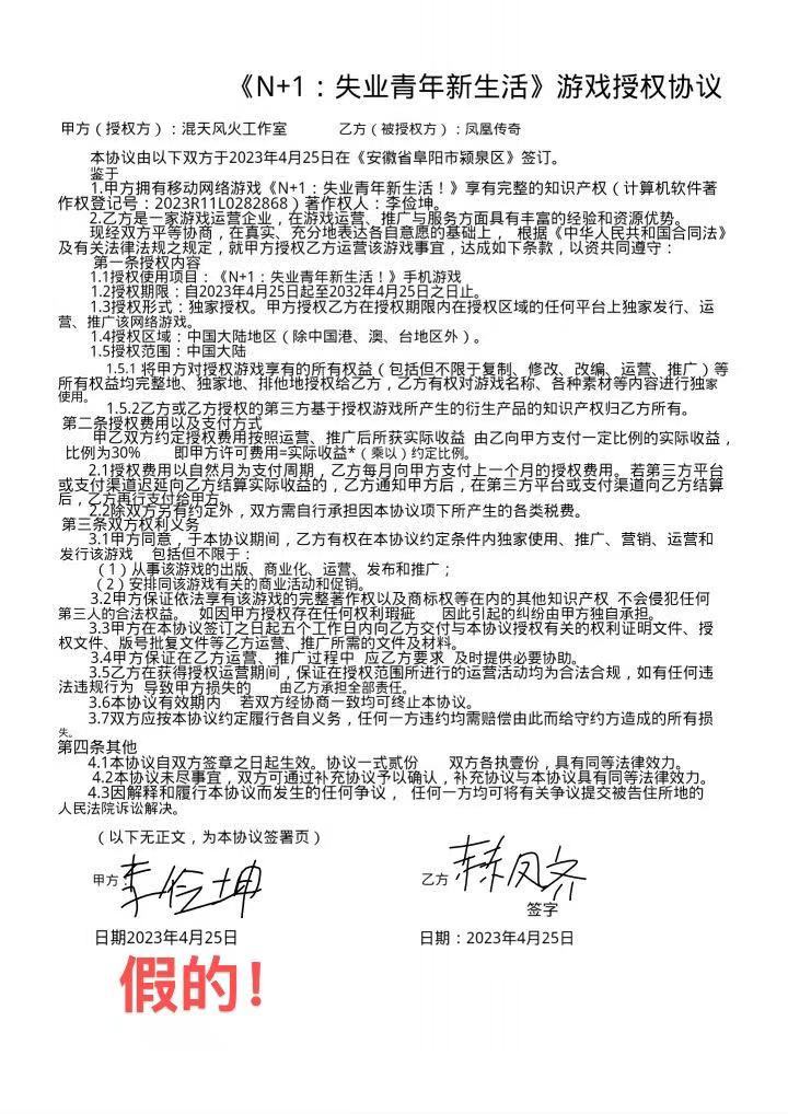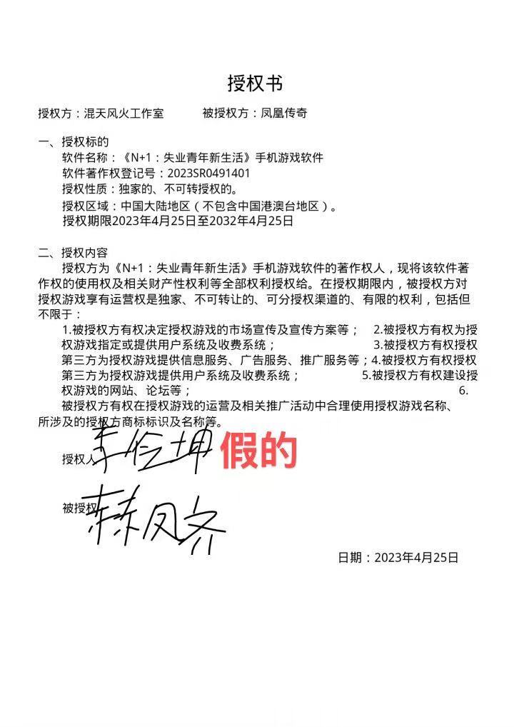 【郑重声明】关于“赫凤齐”假冒“凤凰传奇”并伪造《N+1》游戏授权协议的声明