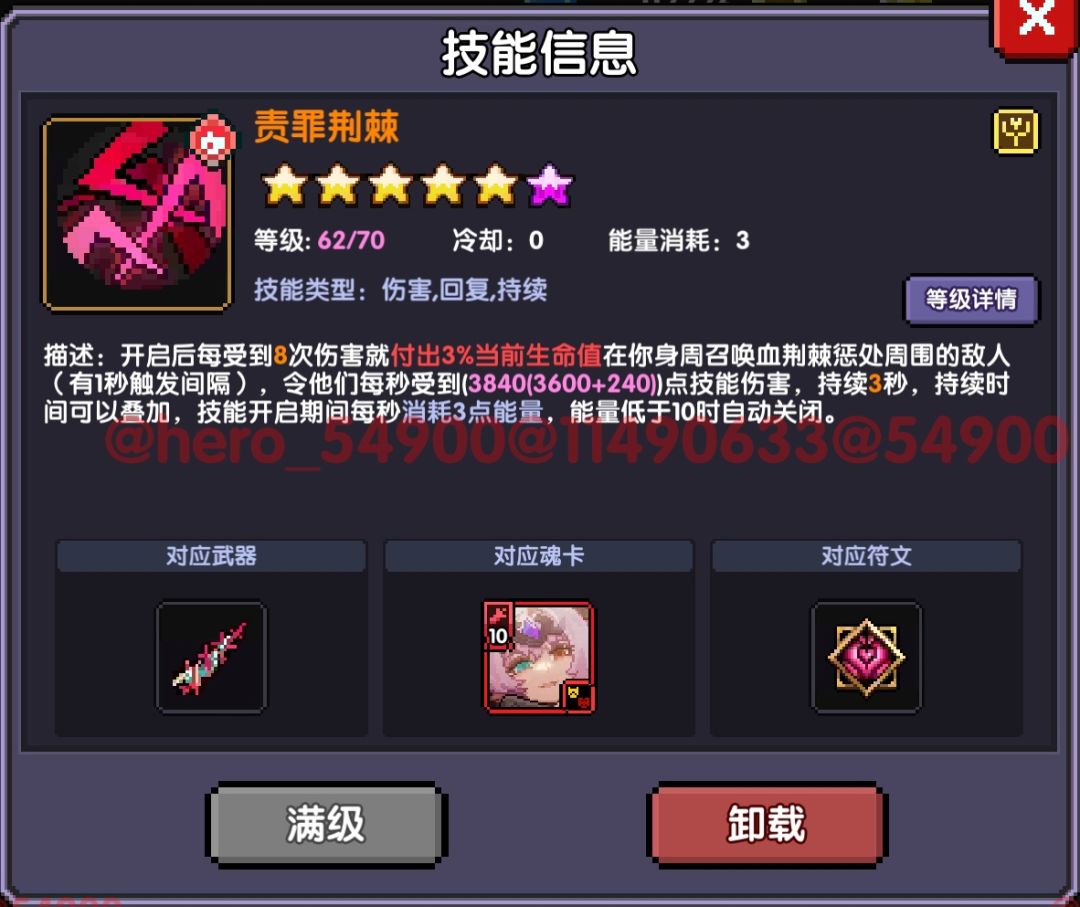 每受到8次伤害,橙技能对怪物施加持续伤害,有1s触发间隔,不受武器伤害加成