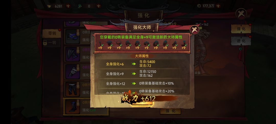 装备强化和进化升星也有很大加成,强化石强化装备,全身强化+6 +9甚至更高都有属性加成,装备进化会消耗材料,有概率进化失败,不过首次80%成功率当然赌一把最香