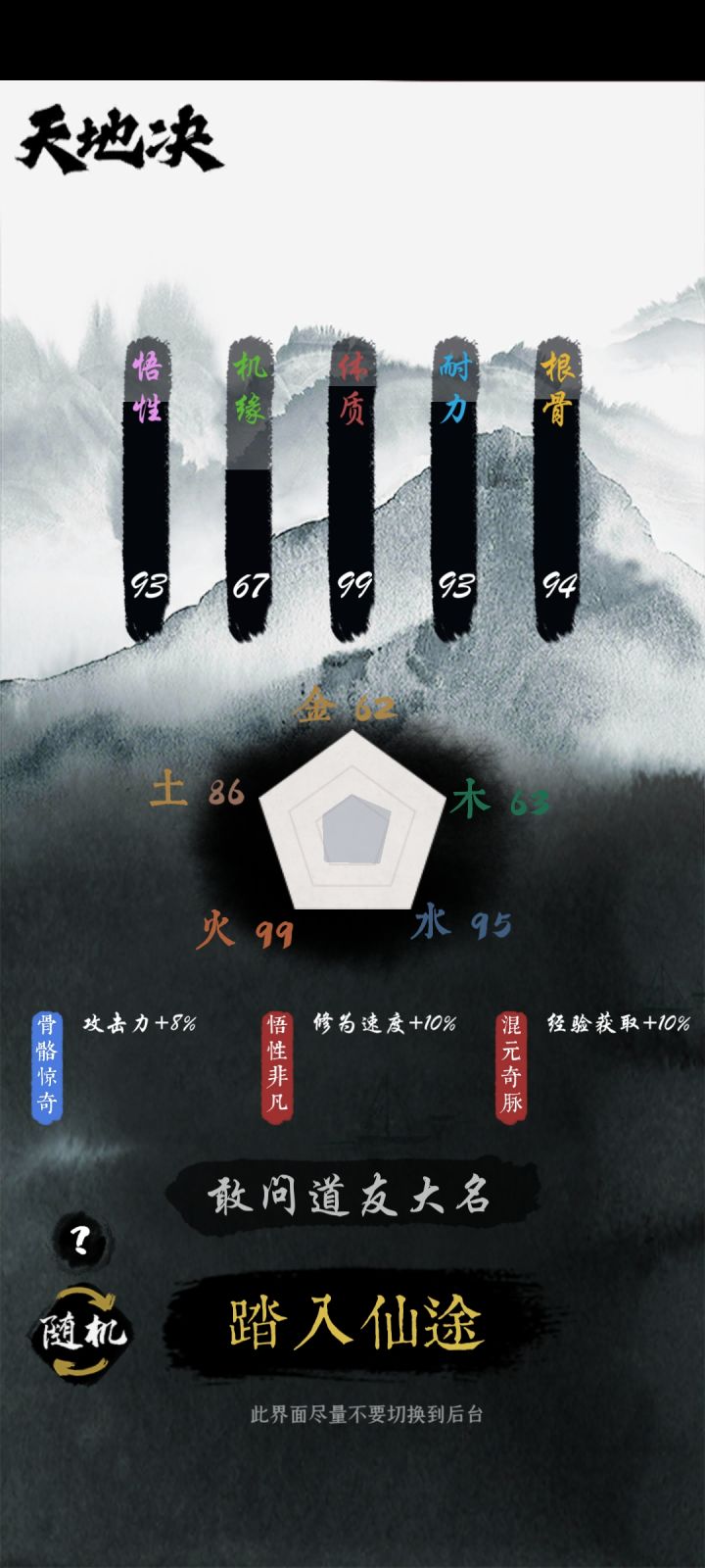 欧皇:天命+一夫+金刚+资质95、五行90+不可能全部90+以上,需要取舍,灵根金火灵根95+以上就可以。(不要执念于欧皇开局,这只是一个放置挂机单机游戏!再者,修仙之路怎么可能人人都天赋异禀呢,差不多就可以开局了