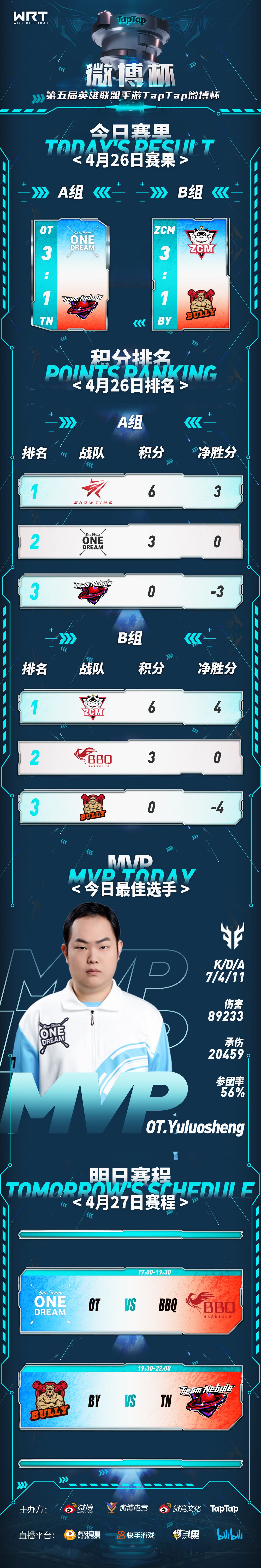 4月26日,第五届英雄联盟手游TapTap微博杯小组赛Day3战罢,赛果如下: