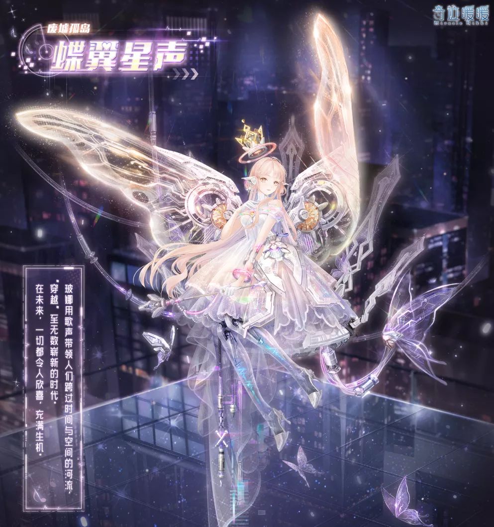 【蝶翼星声】含正常姿势与特殊姿势,全新妆容“自由歌唱”,精美面饰“时空刻痕”,机械耳饰“机械风笛”,机械蝶翼“炫彩蝶翼”、“未来之翼”,精美可移动摆件“翩跹韵律”、“飘游乐章”,未来系皮肤部件“透明心弦”。